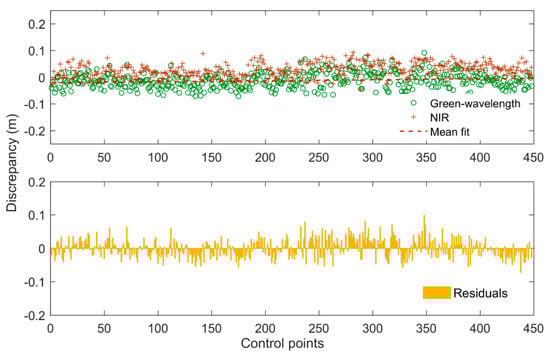 Using the least-squares statistical method, we compared 448 ground GPS survey point elevations to lidar derived surface TIN patches []. For both scanners, the correlation produced high confidence (R2 > 0.95). Each scanner’s median height bias and RMSE were less than 2.8 cm. Findings revealed a minor height bias between the scanners (<4 cm), conceivably caused by NIR and green wavelength pulses registering different surface heights due to beam divergence differences (Table 5, Figure 4).