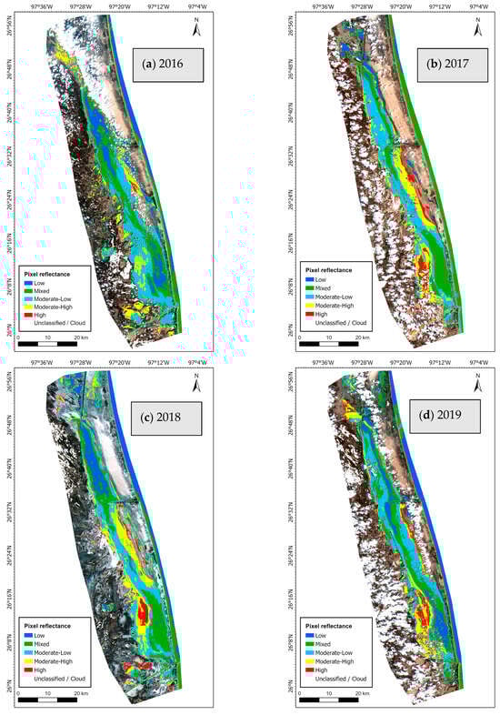 (a–d) Pixel reflectance as recorded with Sentinel-2A L1C Band 5, classified using ENVI v5.5 ISODATA algorithm.