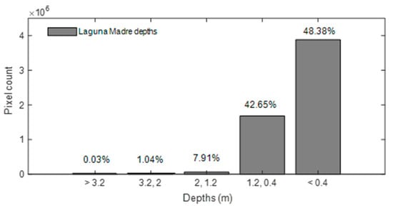 Chiroptera measured the lagoon bottom deepest at 3.35 m in Area-1 and 4.25 m on the northeastern edge of the survey area, at the Gulf coastline. Lidar measurements indicated the mean depth of the lagoon was no more than 0.61 m, where 42.65% of the depths registered were between 0.4 m and 1.2 m, and only 1.07% of measurements were deeper than 2 m (Figure 6).