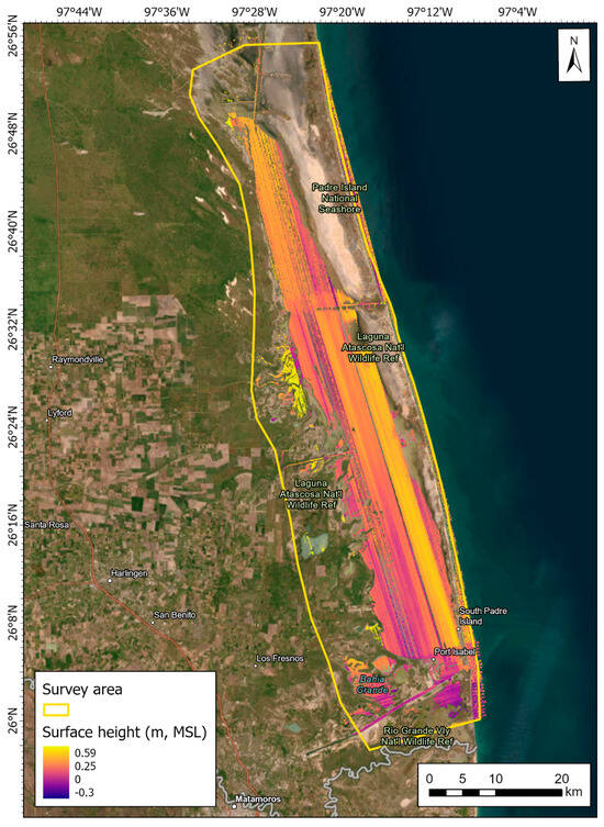 We completed the lidar data acquisition campaign in approximately 60 flight hours. Due to the tides, surface datasets revealed height differences of 0.84 m (lowest = −0.28 m MSL, highest = 0.56 m MSL) in two weeks. The mean surface height was 0.04 m, and the standard deviation was 0.18 m throughout the data acquisition campaign. Surface height variation aligned with the 0.9 m tide range that was observed at the Port Isabel gauge in May 2017 (Figure 7).