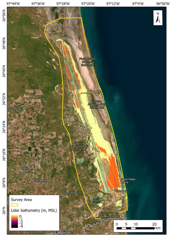 In 2017, the Bureau of Economic Geology (BEG) at The University of Texas at Austin (UT Austin) acquired topographic and bathymetric airborne lidar data over Lower Laguna Madre, a hypersaline lagoon in south Texas. Previously, using an airborne lidar system, BEG researchers completed projects on the Gulf Coast, mapping the shallow seafloor along the Gulf of Mexico and the Pacific Coast [] and investigating bottom morphologies along various river sheds in the southern US [,]. The principal research motivation was to investigate the feasibility of measuring the lagoon bottom with airborne lidar and quantify lidar bathymetry’s accuracy with applicable survey and in-situ methods. We need to emphasize that remote sensing methods used in this study are familiar; however, their application in challenging and varying coastal environments to complement and validate each other is essentially important to the remote sensing community and has not been studied or documented in detail.