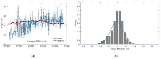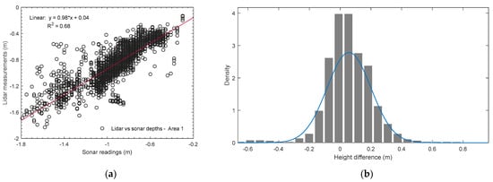 Figure 9. (a,b). In Area-1, lidar and sonar heights produced a linear agreement (R2 = 0.68), indicating higher turbidity levels in depths greater than 1 m. The sonar-recorded slightly deeper compared to lidar measurements (mean difference = 5 cm). - In Area-2, the lagoon bottom was partially visible, and we observed varying Secchi disk depths (0.6–0.9 m). Overall, turbidity has increased (8.6 NTU), and the comparison algorithm matched fewer sonar to lidar measurements (40%), producing less dependable matches, particularly in depths shallower than 1 m, indicating the increased turbidity. The mean lidar depth was −1.09 m MSL, and the sonar measured 14 cm deeper (−1.23 m MSL). The correspondence between the measurements was linear but produced a less favorable agreement (R2 = 0.38, Figure 10a,b).