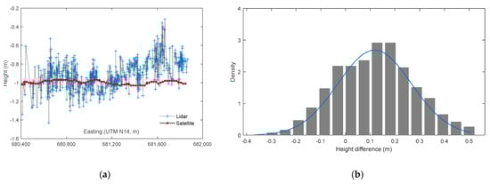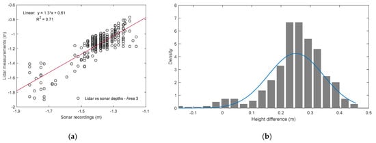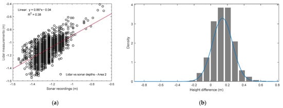 Figure 10. (a,b). In Area-2, turbidity was high in depths shallower than 1 m (mean = 8.6 NTU), scattering and attenuating lidar pulses, influencing the correspondence between lidar and sonar measurements adversely (R2 = 0.38). The mean height difference was 14 cm. - In Area-3, deeper bottom and poor water quality were observed. The Secchi disk depths were recorded between 0.7 and 1.3 m, and we sampled turbidity at 10.5 NTU; hence, lidar beam amplitudes were insufficient to measure the lagoon bottom. With default threshold parameters, the comparison algorithm produced unreliable results; consequently, we applied looser values to the experiment (dS1i = 10 m) and the algorithm included more legitimate matches. As a result, the matching efficiency dropped (8%), and generated a linear agreement (R2 = 0.71). The mean lidar depth was −1.14 m MSL, and sonar measured deeper at −1.39 m MSL (Figure 11a,b).