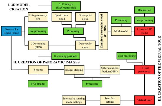 To carry out the current study, three main stages of creating the necessary products were considered. Thus, the first stage focused on the realization of the external three-dimensional model of the Darvas-La Roche House; the second stage concerned the sampling of 360° images showing the interior, because in the last phase, the products obtained from the previous stages of creation were combined to make virtual tours (Figure 2).
