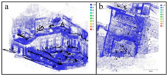 The first result obtained through the photogrammetry technique is the rare point cloud of Darvas-La Roche House. It is characterized by the presence of a large number of raw points, directly proportional to the very large volume of data entered into the software (Figure 8a). The cloud of raw points was manually and automatically filtered to eliminate unwanted points and those that were outside the area of interest. Manual filtering involved the selection and removal of points from the cloud, while for automatic filtering, analyses aimed at determining reprojection errors, projection accuracy, and scene reconstruction uncertainties were applied.
