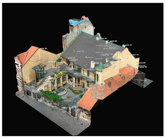 Despite the fact that the data acquired with the UAV benefits from a well-defined coordinate system, thanks to the mountain GPS on the drone, the first step in the process of creating the three-dimensional model of the Darvas-La Roche House was the identification of the target control points on the ground in order to guide the computerized program in the data alignment process and finally achieve a very high level of precision. According to the theory (to be quoted), a number of at least three connection points must be created on the component to be able to align different images and use the coordinate system. Cycling between the images manually and adding control points fixes most alignment issues and helps connect as many photos as possible. In the present case, 97 control points were used (Figure 5), and the results obtained were somewhat consistent, generating clouds of very voluminous points (Figure 6).