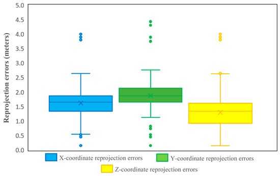 Figure 7 shows the reprojection errors recorded by each Cartesian coordinate (X, Y, Z) of the photos after applying the corrections based on the measurements of the target points in the field. The average value of the error of the X coordinate was 1.5 m, with absolute values between −0.67 m and 0.51 m. Regarding the Y coordinate, the average of the reprojection errors amounts to 1.6 m, with absolute values between 0.2 and 4.4 m. The lowest values were integrated in the case of the Z coordinate, which had average values of 1.2 m and absolute values that deviated between 0.2 and 3.9 m. About 53.9% of the data recorded reprojection errors smaller than 1.5 m after applying the corrections.