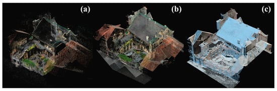 Representation of the results obtained in the process of photogrammetric modeling of the database belonging to Darvas-La Roche House ((a)—the filtered sparse cloud of points; (b)—the dense cloud of points; (c)—the dense cloud of points after decimation).