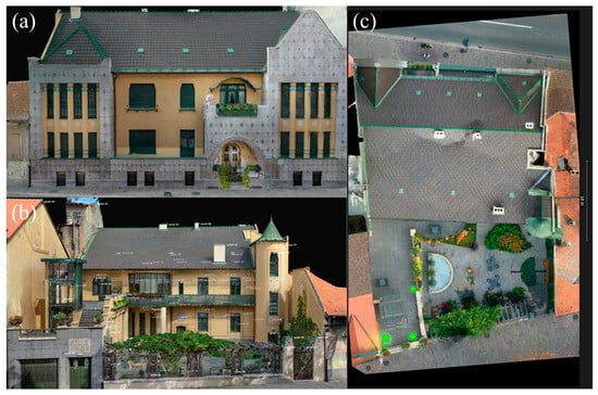The final textured model of Darvas-La Roche House ((a)—main facade of the monument; (b)—rear facade of the monument; (c)—aerial plan view).