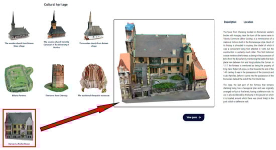 The interface makes a clear separation between cultural heritage sites and natural heritage ones, with Darvas-La Roche House being placed in the first category. After opening the menu dedicated to these buildings and selecting the one that is the object of the current study, users start by viewing the three-dimensional model made by integrating the data obtained from photogrammetry and laser scanning. This visual information is complemented by a descriptive section (both in visual and auditory format), which has the role of giving users some general information about the history of Darvas-La Roche House, the style of construction, and what this represents for Oradea Municipality, as well as an accurate location of the monument within the city, the pin being shared from Google Maps (Figure 14).