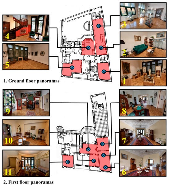 In order to make accessible the most important and interesting features inside the Darvas-La Roche House, it was decided to obtain 11 panoramic images, acquired from different parts of the monument. They show only the rooms where exhibitions are currently organized or rooms that are important to visitors due to their construction, design, or story. The 11 panoramic images created thus lead to the accessibility of nine different rooms, four of which are located on the ground floor of the monument and five on the upper floor (Figure 13). Most of the rooms are permanent exhibitions, which include period furniture, pieces of clothing, jewelry, and various accessories that belong to the “Belle Epoque” era. But within the accessible rooms, there are also some that host only temporary exhibitions, for which a new set of data will be taken, which will be updated in the virtual tour every time the exhibition changes.