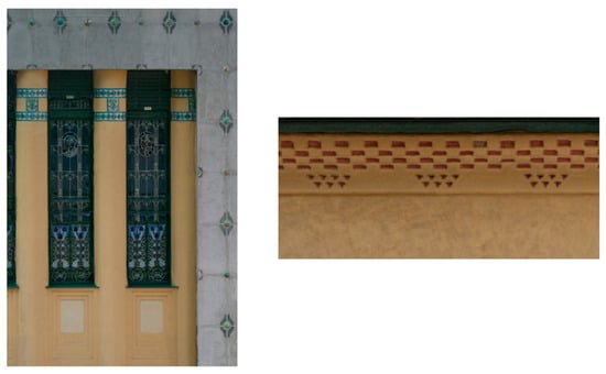 Built in two stages, 1909–1910 (main facade) and 1911–1912 (secondary facade), according to a project by the architects László Vágó and József Vágó, the building offers an exceptional architectural spectacle, embellished by numerous Viennese elements with simplified, geometric shapes that are zoomorphic and anthropomorphic [,,,,]. The composition of the main facade stands out through the volumes that compose it, which are punctuated with decorative Zsolnay ceramic knobs. A special element of the facade is the balcony guarded by a statuary personage who holds in his arms a vessel decorated with star-shaped ceramics. It presents a rich openwork decoration, with the symbolic motifs being pinecones, hearts, and vegetal spirals [,,]. Its artistic value makes it considered one of the most original architectural projects from the beginning of the 20th century.