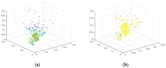 Following data collection, three datasets were compiled: vegetation indexes and the SPAD dataset, texture features and the SPAD dataset, and vegetation indexes combined with texture features and the SPAD dataset during the fruit growth period, resulting in 164 samples. For the litchi fruit growth period and autumn shoot period, 294 samples were acquired from the same three datasets. Each dataset underwent preprocessing, with the SVM algorithm utilized to identify and eliminate outliers. The distribution diagram in Figure 3 illustrates the dataset before and after screening. Figure 3a displays the initial data distribution, revealing both excessive centralization and discreteness. Post-screening, the data distribution demonstrated increased concentration, mitigating the discreteness. Consequently, 134 valid samples were retained for the litchi fruit growth period across the three datasets, and for the litchi fruit growth period and autumn shoot period, 266 groups of valid samples were secured.