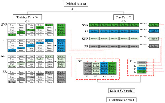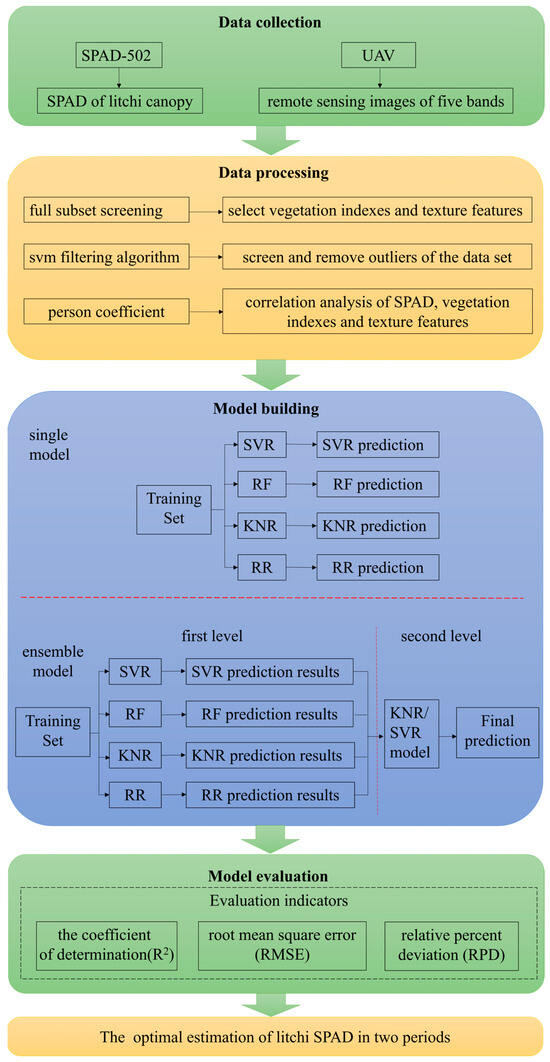 The structure of the stacking algorithm in this paper is illustrated in Figure 4. The study modeled and validated datasets under different combinations of independent variables in various litchi growth stages. It ensured a consistent 7:3 ratio of training sets to verification sets for each dataset, and an equal number of samples in each dataset under each period. Machine learning methods, including stacking, bagging, SVR, RF, KNR, and RR, were employed for modeling and analysis. The predicted values of each model were compared with the measured values to assess the performance of different models, with a specific focus on ensemble learning methods. The research flow chart is presented in Figure 5.