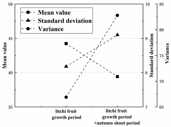 The measured data are depicted in Figure 6. In the litchi fruit growth period, the mean value, standard deviation, and variance of the measured 164 groups of original sample data were 44.237, 8.179, and 66.901, respectively. For the growth period and autumn shoot period combined, the mean value, standard deviation, and variance of 294 samples were 39.425, 9.099, and 82.792, respectively. The SPAD data concentration measured during the litchi fruit growth period exhibited better homogeneity. However, there was little difference between the two statistical datasets, making them suitable for modeling and verification.