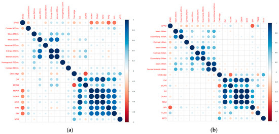 Correlation analysis was conducted on the optimal combination of vegetation indexes and texture features with the measured SPAD values of litchi canopy leaves. The results are presented in Figure 7. In Figure 7a, during the growth and development of litchi fruit, only entropy (650 nm), moment (650 nm), and homogeneity (730 nm), along with the MCARI vegetation index, exhibited positive correlations with the SPAD values of litchi fruit. The Pearson coefficient of homogeneity (730 nm) was the highest at 0.217, indicating a strong positive correlation between homogeneity (730 nm) and litchi SPAD. Conversely, other vegetation indexes and texture features showed negative correlations with the SPAD values of litchi. The Pearson coefficients of the vegetation indexes MSAVI, OSAVI, RDVI, RVI2, and SIPI were higher at −0.531, −0.452, −0.356, −0.571, and −0.544, respectively. These results suggest that most vegetation indexes had a robust negative correlation with litchi SPAD.