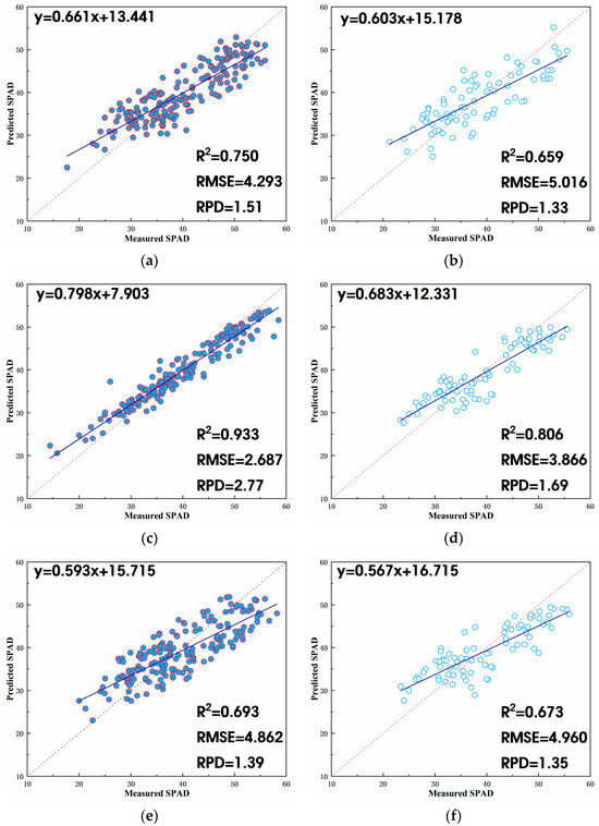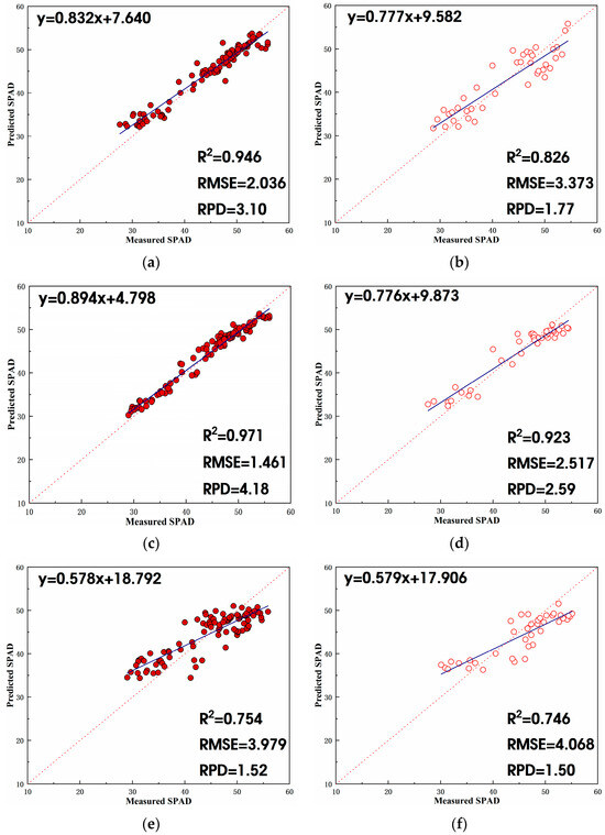 The dataset, after excluding outliers, was partitioned into training and validation sets at a 7:3 ratio. The optimal combination of independent variables was used as input, and the SPAD value of litchi canopy leaves was treated as the output. Various algorithms, including SVR, RF, KNR, RR, stacking, and bagging, were employed to estimate the SPAD value of litchi. The estimation modeling and validation results for the SPAD value of litchi fruit during its growth period and autumn shoot period are presented in Table 4.