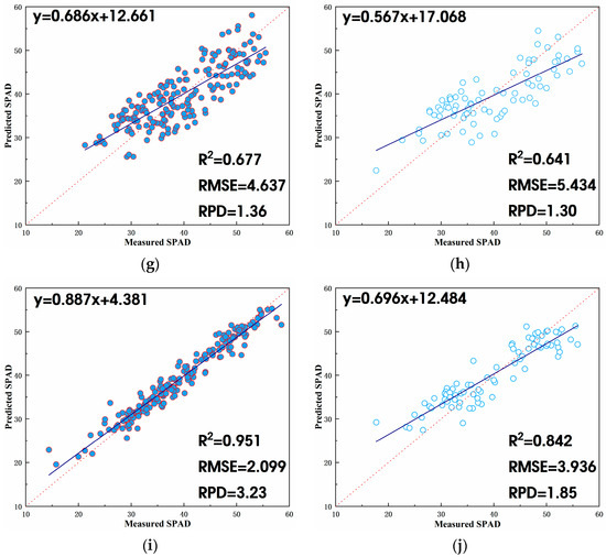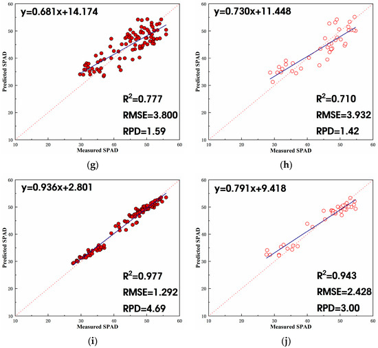 Results of different prediction models based on vegetation index and texture feature during the litchi fruit growth period + autumn shoot period. (a) SVR training set; (b) SVR validation set; (c) RF training set; (d) RF validation set; (e) KNR training set; (f) KNR validation set; (g) RR training set; (h) RR validation set; (i) stacking training set; (j) stacking validation set.
