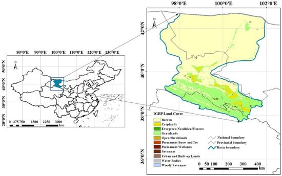 In this study, we primarily adopted the Heihe River Basin as the research area. Heihe River Basin is situated in the semiarid region of northwestern China (37.7°–42.7°N, 97.1°–102.0°E) and is the second-largest inland river basin in China, covering an area of approximately 143,000 square kilometers [42]. The elevation in much of the study area ranges from 2000 to 5000 m above sea level, with an annual average temperature ranging from −3.1 °C to 3.6 °C [43]. Annual precipitation ranges from 200 mm in the downstream grassland areas to 700 mm in upstream mountainous regions [44]. The annual average potential evapotranspiration (PET) ranges from approximately 700 mm to 2000 mm [45]. The basin exhibits distinct geographical features, transitioning from glaciers in the upper reaches to permafrost, alpine meadows, forests, irrigated crops, riparian ecosystems, and deserts downstream. It is characterized by cold and arid landscapes [46]. However, it is important to note that there are different delineation methods for the Heihe River Basin. In this study, we adopted the vector boundary map provided by the National Comprehensive Water Resources Planning for the period between 2002 and 2006. The study year in this paper is 2020, and the precise geographical location of the s tudy area is shown in Figure 1.