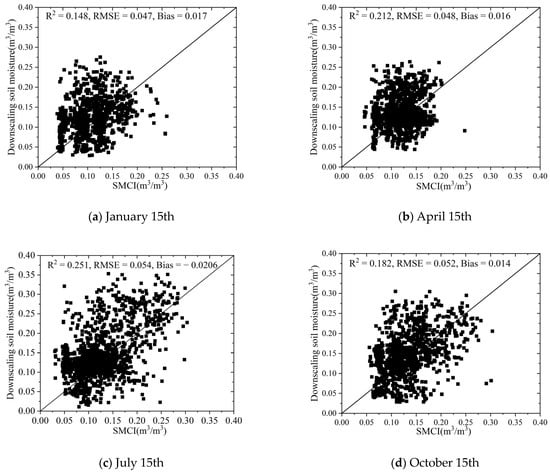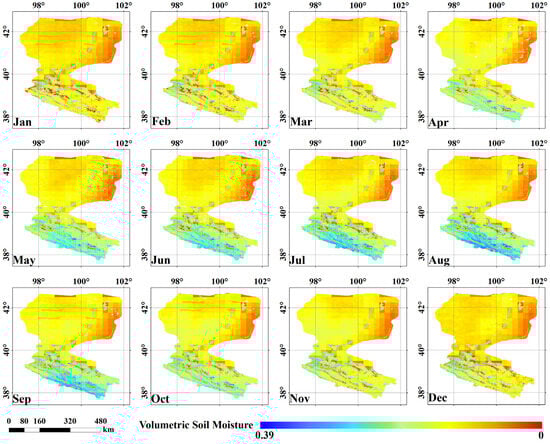 Based on the SM spatial downscaling method proposed by Zhang et al. [25], we obtained a daily 1 km SM dataset for the entire year of 2020. To ensure the reliability of downscaled results, this study employed a random sampling method to generate 1000 pixel points as samples within the Heihe River Basin. The downscaled results were compared with the published 1km SMCI soil moisture products on 15 January, 15 April, 15 July, and 15 October. It was observed that the scattered points were relatively evenly distributed around the 1:1 line, indicating a good correlation between the downscaled results and the SMCI products (Figure 2). The validation results mentioned above demonstrate that the downscaled soil moisture in this study can provide reliable information and can be used for subsequent spatiotemporal analysis. In previous SM analyses, long time series data were often used for analysis, with a better temporal scale, and these studies mainly focused on annual averages [25,70,71,72,73]. However, we found that SM and some of its driving factors exhibit significant temporal variability in this research. In temperate continental climate zones, like the Heihe River Basin, the driving factors vary dramatically during the different seasons and even different months. Therefore, using annual average SM data alone cannot meet research requirements. In response, we focused on the monthly temporal scale of SM patterns and driving factor analysis, and we synthesized the dataset with respect to monthly averages. Figure 3 shows the spatial distribution of the downscaled monthly SM, and Figure 4 shows the basic statistical characteristics of SM in the study area for each month.