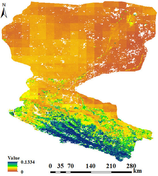 Furthermore, to examine the temporal stability of SM, we categorized SD into five classes based on certain criteria: very poor (SD > 0.2), poor (0.13 < SD < 0.2), stable (0.08 < SD < 0.13), good (0.03 < SD < 0.08), and excellent (SD < 0.03) [23]. This classification was used to explore the temporal stability of SM in the study area. Specifically, in the upper reaches of the basin, the time series SD varies between 0.03 and 0.13, while in the middle and lower reaches, it varies between 0 and 0.03. The overall SD values in the study area are relatively low, with the SD value in the middle and lower reaches being lower than that in the upper reaches. The main reason for this pattern is that the study area belongs to a temperate continental climate with relatively low annual precipitation levels. The overall vegetation cover is limited, and water circulation capacities are relatively low. As a result, the overall temporal stability of SM in the basin is satisfactory. Furthermore, the higher vegetation cover in the upper reaches than that in the middle and lower reaches results in lower SM sensitivity in the middle and lower reaches relative to vegetation seasonal variations. Therefore, the middle and lower reaches exhibit higher temporal stability in SM than in the upper reaches (as shown in Figure 5). In summary, the study area shows significant spatial variability in SM, but the overall monthly scale temporal stability is favorable, and the types of driving factors of SM remain relatively stable across the different months [74].
