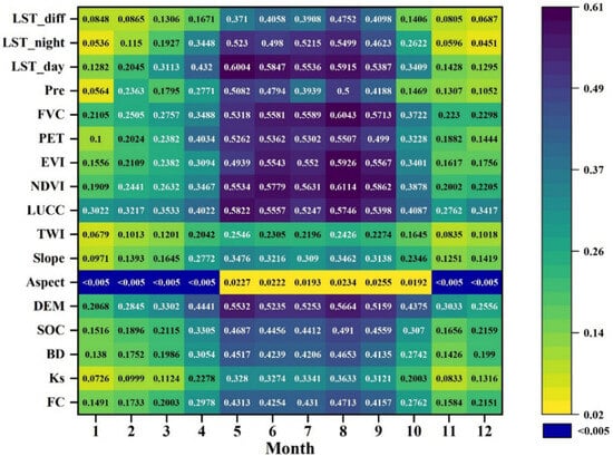 The factor detector results for different months are shown in Figure 6. It can be observed that from January to April and from October to December, the overall q values are relatively low, with the highest q values ranging from approximately 0.3 to 0.45. In these months, land use and land cover (LUCC) is the dominant driving factor of the spatial distribution of SM, especially from January to March and December. Additionally, factors such as elevation, FVC, and NDVI exhibit relatively high q values during these months. In April, October, and November, the primary driving factor is elevation, followed by LUCC, FVC, NDVI, and other factors. During the late spring, summer, and early autumn seasons in the study area, the driving factors impose a greater influence on SM. During the period from May to September, factors such as daytime LST, nighttime LST, vegetation parameters (NDVI, EVI, and FVC), PET, and LUCC show a significant driving power, with q values generally exceeding 0.5. In May, the q value of the daytime LST is the highest at 0.6004, while in August, the q value of the NDVI is the highest at 0.6114, indicating that these factors provide the highest explanatory power for SM in their respective months.