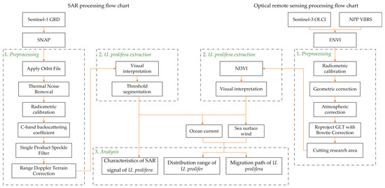 For Sentinel-1 SAR, SNAP was utilized for preprocessing, encompassing precise satellite orbit data correction, polarization data radiation correction, geographical correction, and WGS84/UTM51 projection conversion (Figure 2). Following preprocessing, the spatial resolution stood at 10 m. An ENVI remote sensing analysis was employed for OLCI and VIIRS data preprocessing, as well as for analyzing SAR and optical remote sensing image outcomes. Geometric center-point geographical coordinates of densely concentrated U. prolifera patches were determined through visual interpretation and NDVI threshold segmentation. Thematic mapping was conducted using ArcGIS [36].