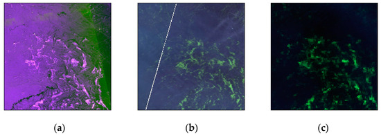 The comparison of local U. prolifera images from 6 June 2021 was conducted among Sentinel-1 SAR (a), Sentinel-3 OLCI (b), and NPP VIIRS (c) remote sensing satellites.