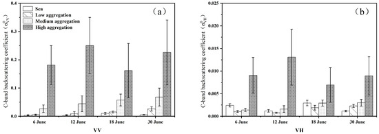 Based on the backscattered signal intensities observed in different aggregation areas in Figure 5 in both VV polarization mode and VH polarization mode, regions characterized by high U. prolifera aggregation consistently exhibit signal strengths four to seven times higher than those in areas with low U. prolifera aggregation. This difference can be attributed to the accelerated vegetative growth of U. prolifera in highly aggregated zones [39]. As a result of photosynthesis, these algae produce bubbles, enhancing their buoyancy and causing the formation of U. prolifera patches on the sea surface. The radar scattering coefficient for an area of vegetation is not only influenced by radar system parameters but is also dependent on the complex dielectric constant, vegetation coverage, surface roughness, and vegetation moisture content, among other factors. As the exposed area of U. prolifera increases, its dielectric constant experiences a rapid rise accompanied by an amplification in radar echo intensity. Consequently, when radar waves interact with these floating U. prolifera clusters, strong scattering and angular reflection occur, leading to a significant portion of electromagnetic waves being reflected back and received by the radar antenna. However, in middle- and low-aggregation areas, U. prolifera exhibits reduced buoyancy and predominantly lies below sea level. Consequently, the majority of electromagnetic wave signals are reflected by the smooth surface of the sea, resulting in minimal signal reflection back to radar antennas. This discrepancy leads to significant variations in backscattered signals between areas of high and middle-to-low aggregation. From the perspective of different polarization modes, the backscattering coefficient in VV polarization mode for the C-band is 15 to 20 times higher than that in VH polarization mode. This is because SAR transmits and receives signals perpendicular to the water body in VV polarization mode, which makes radar signals penetrate the water body better to obtain the information of U. prolifera under the seawater surface [40]. Based on the scattering coefficients of various ground objects, the backscattering coefficients of low-, medium-, and high-aggregation areas of U. prolifera are from 1.4 to 4, from 7.1 to 13, and from 43 to 65 times higher than those of seawater, respectively, in VV polarization mode; this differentiation is significant and serves as an effective index for identifying U. prolifera with a good correlation to the intensity of its aggregation. In VH polarization mode, changes in were not obvious for low- and middle-aggregation areas but only increased by more than three times for high-aggregation areas.