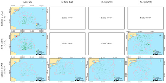 Sentinel-3 OLCI, NPP VIIRS and Sentinel-1 SAR remote sensing images of the study sea area on 6 June, 12 June, 18 June, and 30 June 2021.