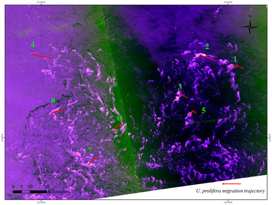 The angle between the central migration direction and the wind direction of the eight high-aggregation patches of U. prolifera was between 0° and 110°. The results show that in this sample observation, the movement direction of U. prolifera was mainly controlled by the site of the sea surface current when the wind speed was low and the wind stress was weak, and there was no obvious consistency with the wind direction. The locations 1, 2, 5, and 8 of U. prolifera were distributed in a chain pattern along the wind direction. The angle between the migration direction of U. prolifera and the wind direction at points 1, 7, and 8 was less than 10°, indicating that the distribution and migration of floating U. prolifera are or were affected by wind [6,25].