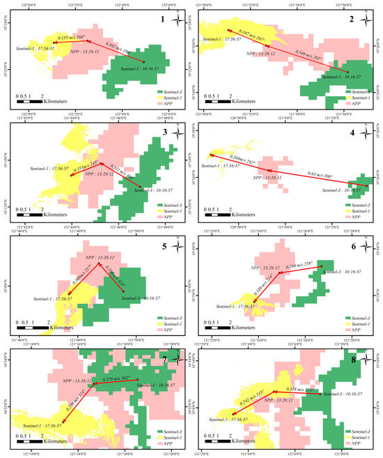 The Sentinel-3, NPP, and Sentinel-1 remote sensing satellites traverse the Yellow Sea monitoring area in the morning, afternoon, and evening of the same day, respectively. By analyzing the migration trend of U. prolifera, researchers can provide short-term warnings for green tide development trends and effective information support for prevention and control efforts. In light of the driving force behind U. prolifera migration, this study utilized wind assimilation data from the European Centre for Medium-Range Weather Forecasts (ECMWF) and sea surface ocean current data with three-level resolution from NASA’s OSCAR to facilitate an analysis of the impact of external driving forces on U. prolifera migration. The detection of U. prolifera drift from a remote sensing image is based on the detection of the displacement of its patch characteristic points and the calculation of the drift speed combined with the time difference. The weather in the sea area of the study area on 6 June 2021 was clear and cloudless, and the distribution of U. prolifera corresponding to the imaging time is shown clearly in Figure 3. In order to analyze the migration path of the same high-aggregation area, spots representing the same high-aggregation area were delimited. Combined with the enhanced color composite image, the corresponding image point was determined by comparing the three images, and the output coordinate information was recorded to obtain the geographic latitude and longitude of the approximate center point of the high-aggregation block on the three satellite images on 6 June, totaling eight points of typical spot data (as depicted in Figure 8). The migration velocity of each point was then further analyzed and calculated.