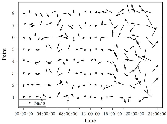 Time series of wind speed and direction at the center points of eight U. prolifera high-aggregation blocks on 6 June.