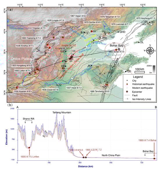 (a) Distribution of active tectonics and historical earthquakes in North China; historical seismic data from the Catalogue of Historical Strong Earthquakes in China []; fault data from the Seismic Activity Fault Prospecting Data Center (https://www.activefault-datacenter.cn, accessed on 5 August 2013); Hongdong earthquake isoseismic line [], Huaxian earthquake isoseismic line [], Tanlu earthquake isoseismic line [], Heze earthquake, Bohai earthquake, Haicheng earthquake, Tangshan earthquake isoseismic line [], and Xingtai earthquake isoseismic line []. All the isoseismic lines were produced by using the Chinese intensity scale with 12 levels. The red dashed line indicates the Tangshan–Hejian–Cixian fault, and the yellow dashed line indicates the seismic null zone trace []. BJ: Beijing, TJ: Tianjin, TS: Tangshan, HC: Haicheng, DL: Dalian, QHD: Qinhuangdao, JN: Jinan, QD: Qingdao, TC: Tancheng, ZZ: Zhengzhou, XA: Xi’an, TY: Taiyuan, SJZ: Shijiazhuang, XT: Xingtai, HD: Handan, HZ: Heze, TX: Tongxian, SH: Sanhe, TG: Tanggu, HG: Hangu, LT: Laoting, YK: Yingkou, CX: Cixian, HD: Hongdong, FY: Fenyang, and YX: Yingxian. (b) Topographic profile of line segment AB. The blue and red lines represent the maximum elevation and minimum elevation curves of the strip topographic profile, respectively.