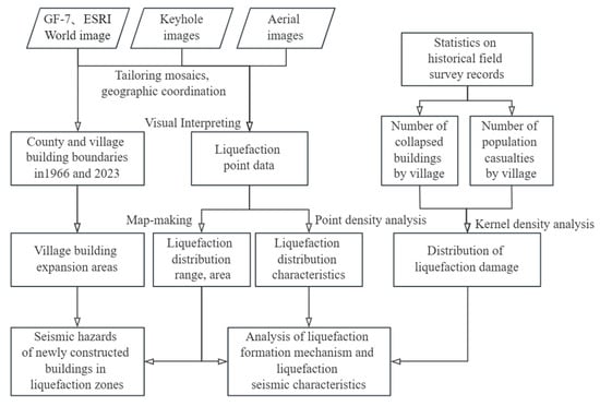 The initial development of remote sensing imagery has allowed for the accurate tracing of certain earthquakes that occurred in the recent past. Surface liquefaction is a short-lived phenomenon and must be recorded within a short period after an earthquake; thus, field investigations must be highly efficient. The Xingtai earthquake is one of the few recent earthquakes for which high-quality short-term post-earthquake aerial images, Keyhole satellite images, and detailed field survey data are available. Based on multiple image records of this earthquake, multisource high-resolution images were used to provide a more complete interpretation of the liquefaction phenomenon in this earthquake case. We used ArcGIS software (http://www.esri.com/software/ArcGIS, accessed on 1 September 2022) to align the keyhole images and then identified and vectorized the liquefaction points on the images. The final liquefaction database was verified against descriptions of liquefaction in the literature, and the topographic background was overlapped for detailed mapping. The software counts the number of liquefaction points, calculates the liquefaction area, and provides information on the extent of liquefaction, distribution patterns, and characteristics. In addition, the statistics on the number of collapsed buildings and population casualties from the book “1966 Xingtai Earthquake Fact Sheet” are collated, and the data are used to make the seismic damage kernel density map with ArcGIS. Finally, by combining the interpretation results and field study records and taking into account many factors, such as the regional sedimentary structure and water system conditions, we analyzed the formation mechanism of widespread liquefaction by this earthquake. Figure 2 shows a flowchart of this procedure.