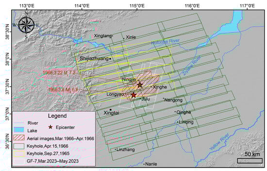 Liquefaction after the Xingtai earthquake is representative of this phenomenon that occurred throughout the around the Beijing Metropolitan Area and Bohai Rim and has reference value for the entire North China Plain region (Figure 1). Detailed liquefaction damage information and research experience can be obtained by studying the entire range of liquefaction that occurred after the Xingtai earthquakes [,,,]. Previous liquefaction studies of the Xingtai earthquake were based on field investigations and concentrated in local areas. Because of time and technological limitations, more comprehensive liquefaction distribution maps and characteristics have not been obtained. In modern times, the detailed study of coseismic liquefaction events has increased. There are more efficient and intelligent tools and methods to obtain the complete range of recent coseismic liquefaction. Thus, older events with high-quality archive images can also be studied further with advanced technology, which can help reveal macro-features that were not detected in previous site visits and elucidate the factors influencing liquefaction induced by the Xingtai earthquakes. Based on the previously collected field survey data, this study proposes a method to accurately locate and quantitatively record the liquefaction orientation, distribution range, and further feature analysis using image data. This paper represents a reference for the research methods of sediment deformation caused by recent modern earthquakes in the North China Plain region and provides basic information for identifying liquefaction-prone zones caused by modern earthquakes and preventing and controlling liquefaction hazards.