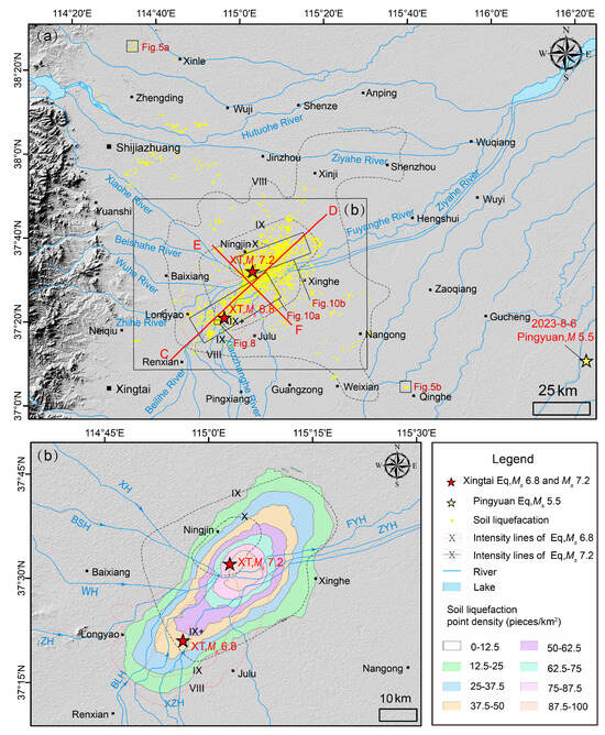 On 8 March 1966, an earthquake of Ms 6.8 occurred in the area of Malan village, Longyao County, Xingtai District, Hebei Province, at a depth of 10 km and an intensity of IX degrees in the epicenter area, and on 22 March, another earthquake of Ms 7.2 occurred in the area of Dongwang village, Ningjin County, at a depth of 9 km and an intensity of X degrees in the epicenter area []. These two major earthquakes caused damage in more than 100 counties in Hebei Province and neighboring areas []. A destructive earthquake of approximately M 6 occurred in the Xingtai area in 777 A.D., and in the subsequent 1189 years, namely, to 1966, eight earthquakes of M 4.5 or greater occurred in the area, with the Ms 7.2 earthquake on 22 March 1966 being the largest ever reported []. The 1966 Xingtai earthquake was the first destructive earthquake to occur in a densely populated area since the founding of the People’s Republic of China [], and its epicenter was close to Beijing. Researchers from the Chinese Academy of Sciences, Ministry of Geology, and other departments visited the earthquake site immediately afterward to carry out observations and research. In-depth investigations and on-site studies revealed that earthquakes may have precursors that could help to forecast future events, thus providing insights for future research on earthquake forecasting and promoting investigations into earthquake causes in China. Researchers observed extensive liquefaction phenomena during the Xingtai earthquake site investigation. Some researchers even witnessed ground liquefaction during the 22 March earthquake []. The most serious manifestation of surface liquefaction is sandblast, which is one of the main causes of ground damage []. Liquefaction has caused farmland flooding, well blockage, river embankment damage, and house sinking, cracking, and collapse, thereby threatening the safety of people’s lives and property [].