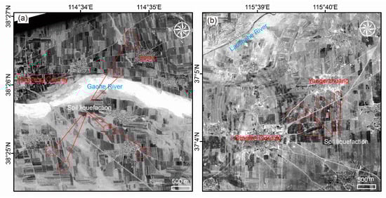 According to the 1966 Xingtai Earthquakes Fact Sheet, ground cracks and sandblasting also appeared in low-lying wet areas of riverbanks and old river channels from Xingtang City in the north to Linzhang and Nanle Counties in Henan Province in the south, Linqing Counties in Shandong Province in the east, and Taihang Mountain foothills in the west. However, liquefaction has not been fully interpreted in these areas because of issues with image resolution and timeliness [], and outside the epicenter, the amount of liquefaction did indeed decrease significantly (Figure 4a). We found that the liquefaction points were distributed as far north as the village of Baiba in Xingtang County on the north bank of the Gaohe River, which is approximately 140 km from the epicenter (Figure 5a), and as far south as Qinghe County on the right bank of the Laosha River, which is approximately 90 km from the epicenter area (Figure 5b).