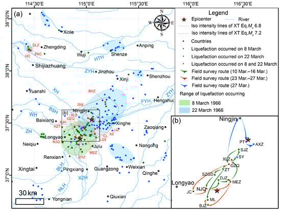 The 8 March intensive sandblast area occurred in a northeast direction and was distributed within a belt with a length of approximately 40 km, a width of 20 km, and an area of approximately 570 km2. This area was mainly distributed in the south of Gengzhuanqiao, north of Beiyanchi, and on both sides of the Fuyanghe and Xiaozhanghe Rivers (Figure 4). After the earthquake on 22 March, the sandblasted area continued to develop and extend in the northeast direction, with a dense distribution area that was approximately 50 km in length, 40 km in width, and 2000 km2. This area was mainly distributed from Gengzhuangqiao village in the northeast to the area around Dadongsi and Gengzhuangsi villages in Shulu County. Both the 8 and 22 March earthquakes had sandblast areas in the same direction; however, the 22 March earthquake caused much more liquefaction than the 8 March earthquake (Figure 6a). Prof. Gao Weiming of the Institute of Geology, China Academy of Sciences, followed different routes to explore the liquefaction phenomenon from the first main earthquake; three investigations were conducted, from 10 to 16 March, 23 to 27 March, and after 27 March (Figure 6b), and the distribution of coseismic liquefaction was confirmed and recorded in the villages around the epicenter after the 8 March earthquake; some of the sandblasted holes had stopped gushing water but had begun leaking muddy water after the second mainshock, and some new liquefaction points were found. Liquefaction occurred in the villages of Gengzhuangqiao, Maoerzhai, and Niujiaqiao during both earthquakes, suggesting that several villages experienced more than one liquefaction event during the Xingtai earthquake swarm, which may have resulted in the merging of multiple liquefaction phenomena [].