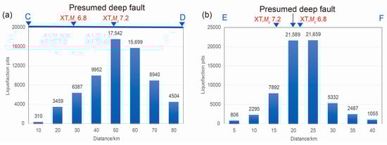 Frequency statistics of liquefaction points along inferred deep faults (counted in 10 km intervals) and the vertical strike (counted in 5 km intervals). The locations of profiles CD and EF are shown in Figure 4.