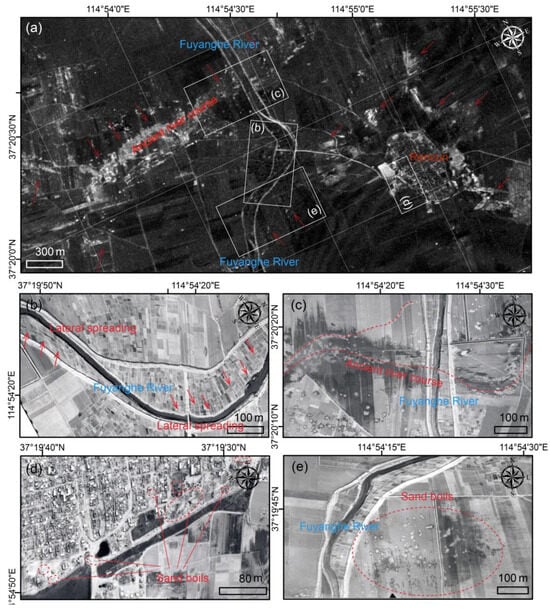 (a) Liquefaction phenomenon around Ren Village, with the specific location shown in Figure 4; (b) lateral spreading phenomenon; (c) liquefaction along the remains of the ancient river channel; (d) sandblasted holes in the village; and (e) liquefaction phenomenon near the riverbank.