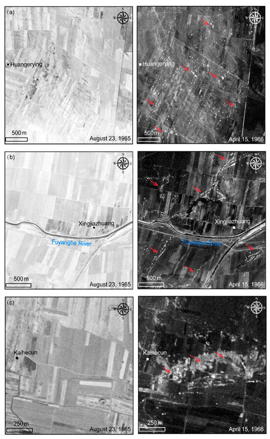 Keyhole satellites are optical reconnaissance satellites developed by the American military that have a high resolution that far exceeds that of commercial satellites of the same period, and three sets of images from 1959 to 1984 have been declassified and made available for download. We acquired multiperiod Keyhole images with a resolution of approximately 3 m covering an area of approximately 50,000 km2 from the USGS (https://earthexplorer.usgs.gov/, accessed on 11 November 2022) for the period before the earthquake (23 August 1965) and for one month after the earthquake (15 April 1966). After the Xingtai earthquake, the relevant departments also carried out aerial imaging, starting on 12 March and ending on 3 April to preserve valuable preliminary information on the distribution of the damage caused by the earthquake. The total area covered by aerial photography was 1704 km2, with 225 km2 after the first earthquake and 1479 km2 after the second earthquake []. Because aerial images covered only the severely damaged area while the Keyhole image comprehensively covered the full range affected by this earthquake, the aligned post-earthquake Keyhole image was chosen to interpret the liquefaction phenomenon over a fuller range. Aerial images assist in the interpretation of liquefaction details. Pre-earthquake Keyhole imagery was used to examine the identified liquefaction and eliminate the possibility that liquefaction occurred prior to the earthquake (Figure 3). In addition, GF-7 images were acquired from the China Resource Satellite Application Center (https://data.cresda.cn/, accessed on 7 May 2023) and ESRI world images (with a spatial resolution of 0.6–1.2 m) to identify the extent of rural buildings, and these images were supplemented with field UAV photographs to preliminarily identify the structures representing newly built houses. By comparing the building boundaries between 1966 and 2023, we obtained the range of village building expansion and analyzed the seismic risk of newly constructed buildings in the liquefaction zone.
