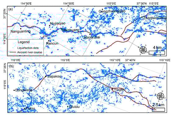 Distribution of the interpreted liquefaction points and ancient river channels. Ancient river channel traces are from []. The specific location is shown in Figure 4.