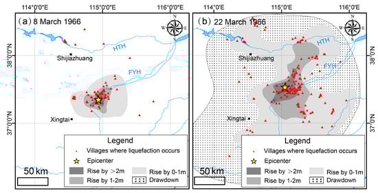 Observations of paleoseismic liquefaction have also shown that sandy soils that initially liquefy during earthquake shaking can liquefy again during aftershocks []. We reviewed detailed records of liquefaction phenomena in villages during the 8 and 22 March earthquakes according to the 1966 Xingtai Earthquake Act Sheet to obtain the villages where liquefaction occurred during both earthquakes, and they are marked with the red square symbol in Figure 6a. Beihouzhuang village, at approximately 27 km from the epicenter of the earthquake, also experienced liquefaction on 8 March, presumably because this area is a low-lying area between two old river channels and the surface deposits are lacustrine sedimentary strata []. The villages of Donglizhai, Hucun, and Ping’ancun, north of Shijiazhuang City, also experienced liquefaction during both earthquakes, which is probably because of their proximity to the left bank of the Hutuohe River.