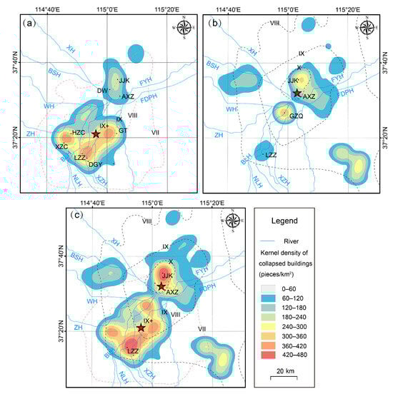 (a) Kernel density map of houses that collapsed in the 8 March earthquake; (b) kernel density map of houses that collapsed in the 22 March earthquake; and (c) total Kernel density map of houses that collapsed in the two earthquakes. Names of rivers are given in the notes in Figure 4. Village abbreviations, JJK: Jiajiakou; DW: Dongwang; AXZ: Aixinzhuang; LZZ: Lianzizhen; DGY: Dongguoying; GT: Guanting; XZC: Xizhangcun; HZC: Hanzhuangcun; and GZQ: Gengzhuangqiao.