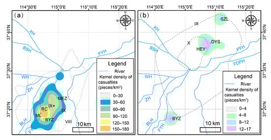 According to the kernel density map generated by counting the number of casualties in each village, the areas with high casualties were distributed in the area from Beiyanzhuang village to Maoerzhai village, which is located in the IX-degree zone. The number of casualties in these areas accounted for approximately 45% of the total number of casualties. The village of Malan was the worst affected, with 490 deaths and 431 injuries (Figure 13a). The areas with high casualties in Dayingshang village and Huangerying village on 22 March were located near the epicenter (Figure 13b). It is worth noting that Beiyanzhuang village, which is far from the epicenter of the earthquake on 22 March, also suffered heavy casualties, and it is assumed that a greater number of collapsed houses in Beiyanzhuang village led to a corresponding increase in the number of casualties. However, the number of casualties caused by the earthquake on 22 March was much smaller than that on 8 March because the earthquake on 8 March occurred at 5.30 a.m. when most villagers were still asleep and did not have time to react. In addition, because most earthquake casualties were caused by building collapse, the number of casualties due to house collapse on 22 March 1966 was greatly reduced because the survivors of the 8 March earthquake were living in temporary tents or shelters.