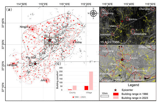 (a) Comparison of the building extent in villages within the high-intensity zone of the Xingtai earthquake in 1966 and 2023; (b) comparison of images of the building extent in the vicinity of the epicenter of the earthquake on 22 March 1966; and (c) statistical histogram of the building area in 1966 and 2023.