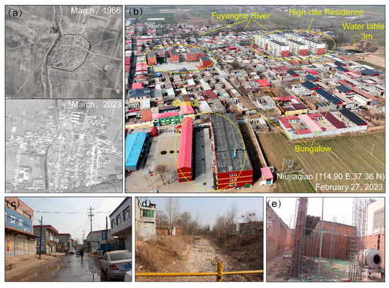 (a) Images of the range of buildings in Niujiaqiao village in 1966 and 2023 at the locations shown in Figure 14; (b) UAV photo of Niujiaqiao village near the epicenter of the earthquake on 8 March 1966 (taken on 27 February 2023), with most of the extended houses built as bungalows with no seismic-resistant measures and few of the school and residential buildings exhibiting seismic-resistant structures; (c) two-story houses next to streets with no seismic-resistant measures; (d) houses built around the adjacent dried-up river channel with no seismic-resistant structures; and (e) new construction of a small number of houses with structural columns.
