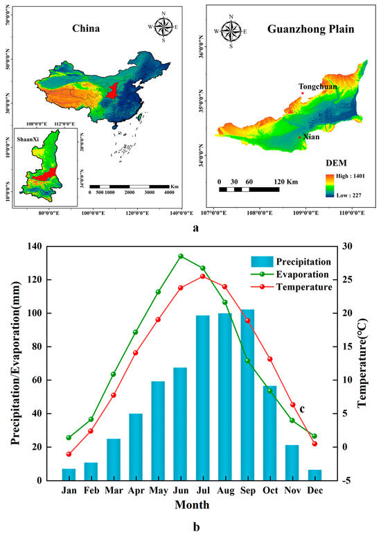 (a) Location map of the Guanzhong Plain; (b) monthly precipitation, evaporation, and temperature in Guanzhong Plain during the study year.