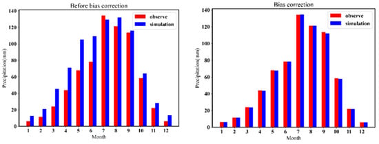 Moreover, the standard deviation is smaller than that of the single mode, and the correlation coefficient is higher than that of the single mode, reaching more than 0.98. As can be seen from Figure 3, the simulated monthly precipitation values before the model correction significantly deviated from the observed values. After the correction, the difference between the simulated and observed monthly precipitation values is controlled, with the maximum error within 5 mm (Figure 4). The constructed deviation correction model can correct the model deviation very well. In conclusion, the simulation effect of multi-mode ensemble averaging is better than that of single-mode. Still, the resolution and accuracy of the mode after ensemble averaging have not reached the accuracy required by this study, so deviation correction and downscaling are necessary.
